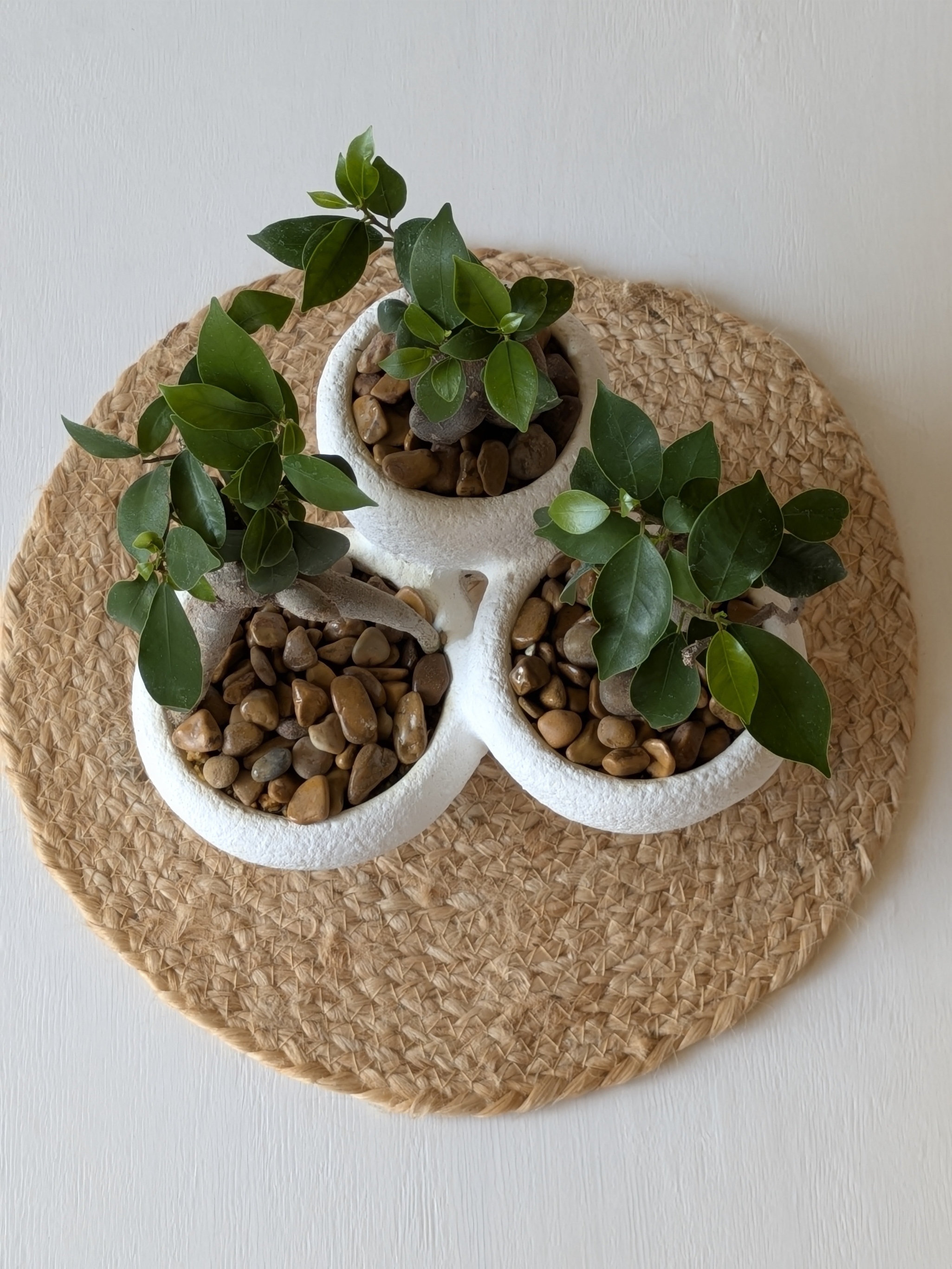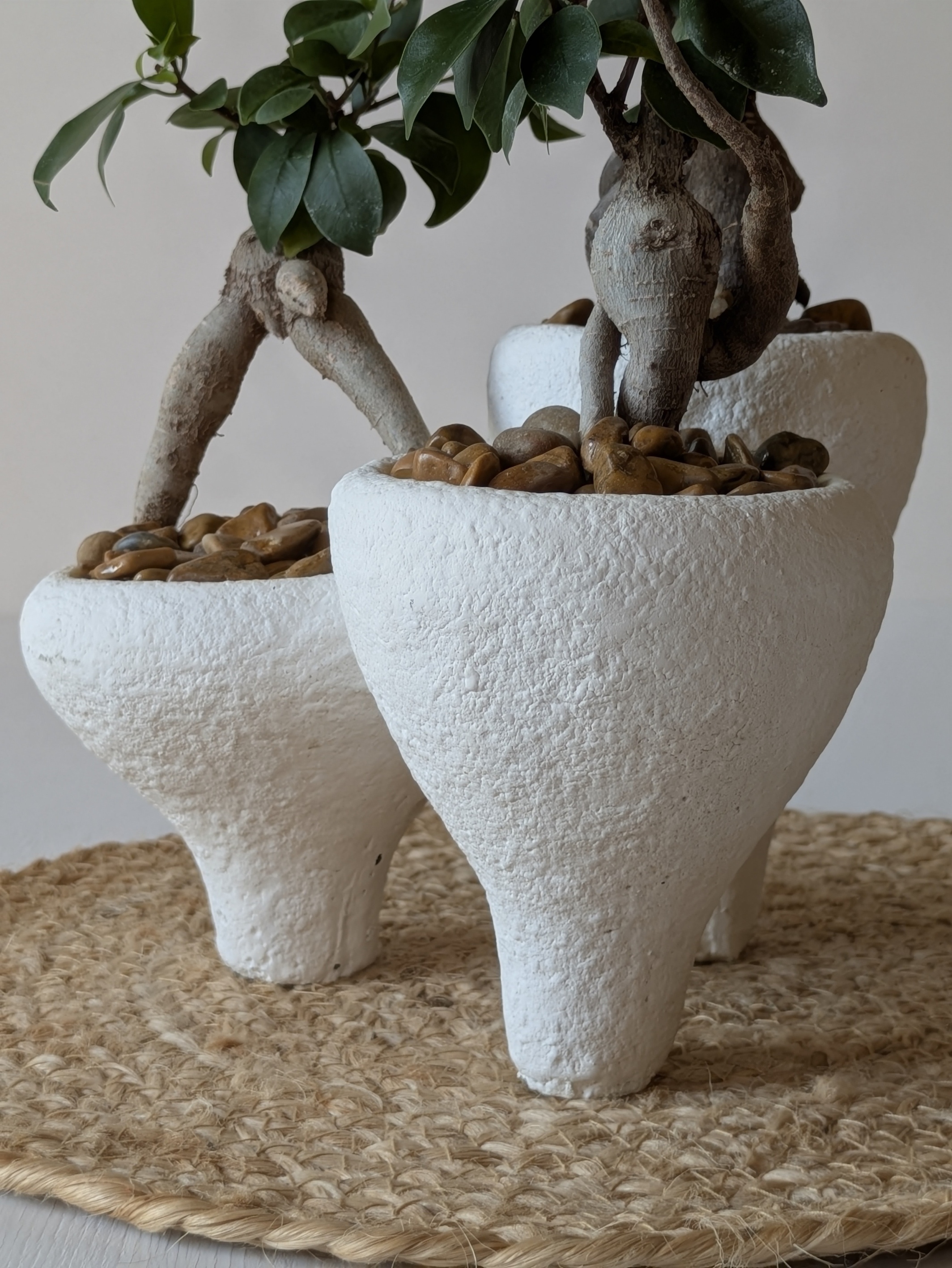 ・大小異なる鉢が合体した、個性的でシンプルな白セメント鉢を使用。