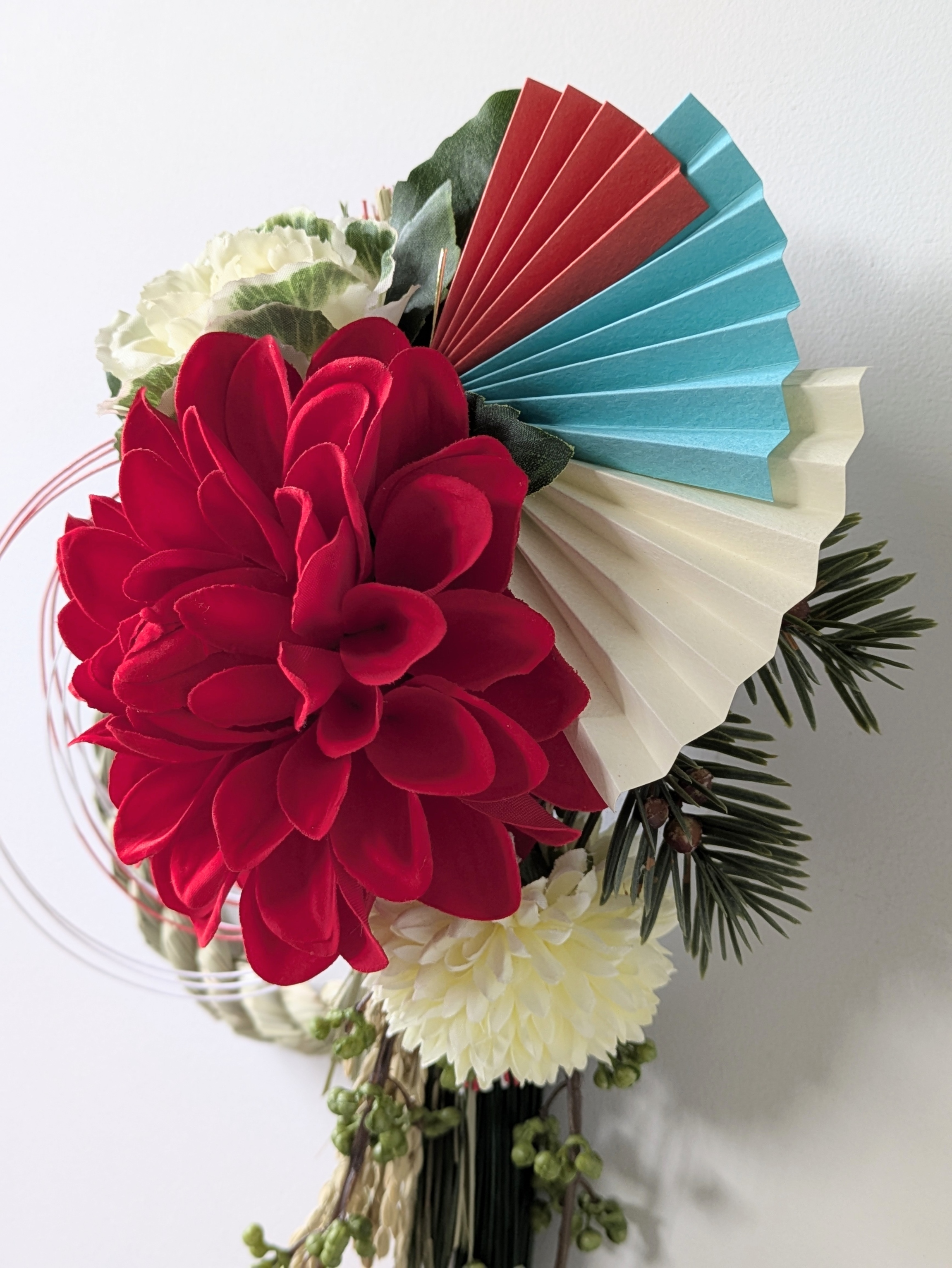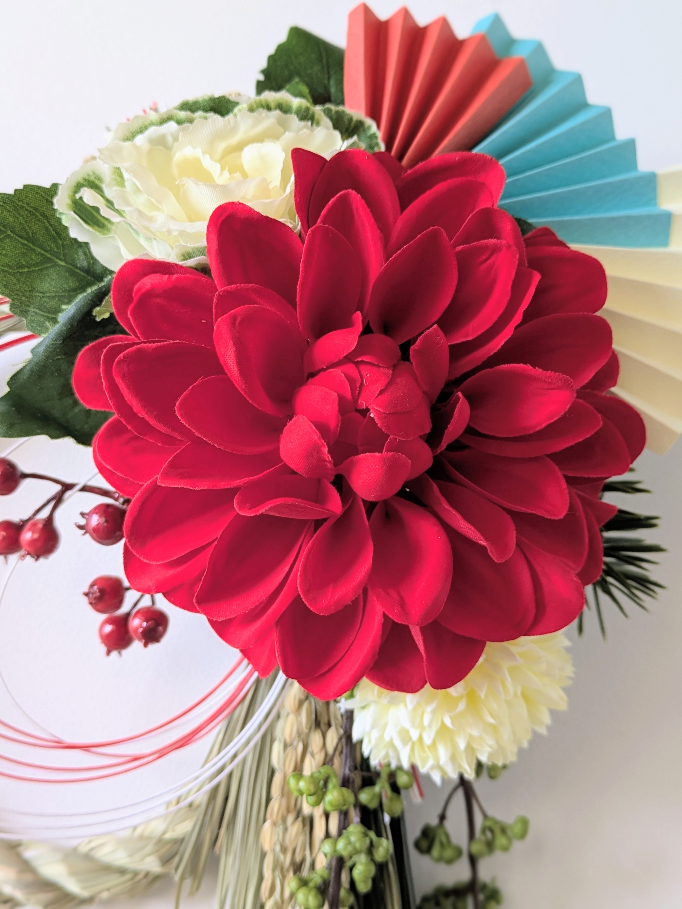 凛と咲き誇る大輪のダリアを主役に、白の葉ボタンとピンポン菊を添えて、紅白の彩りがおめでたいお飾りに仕立てました。
