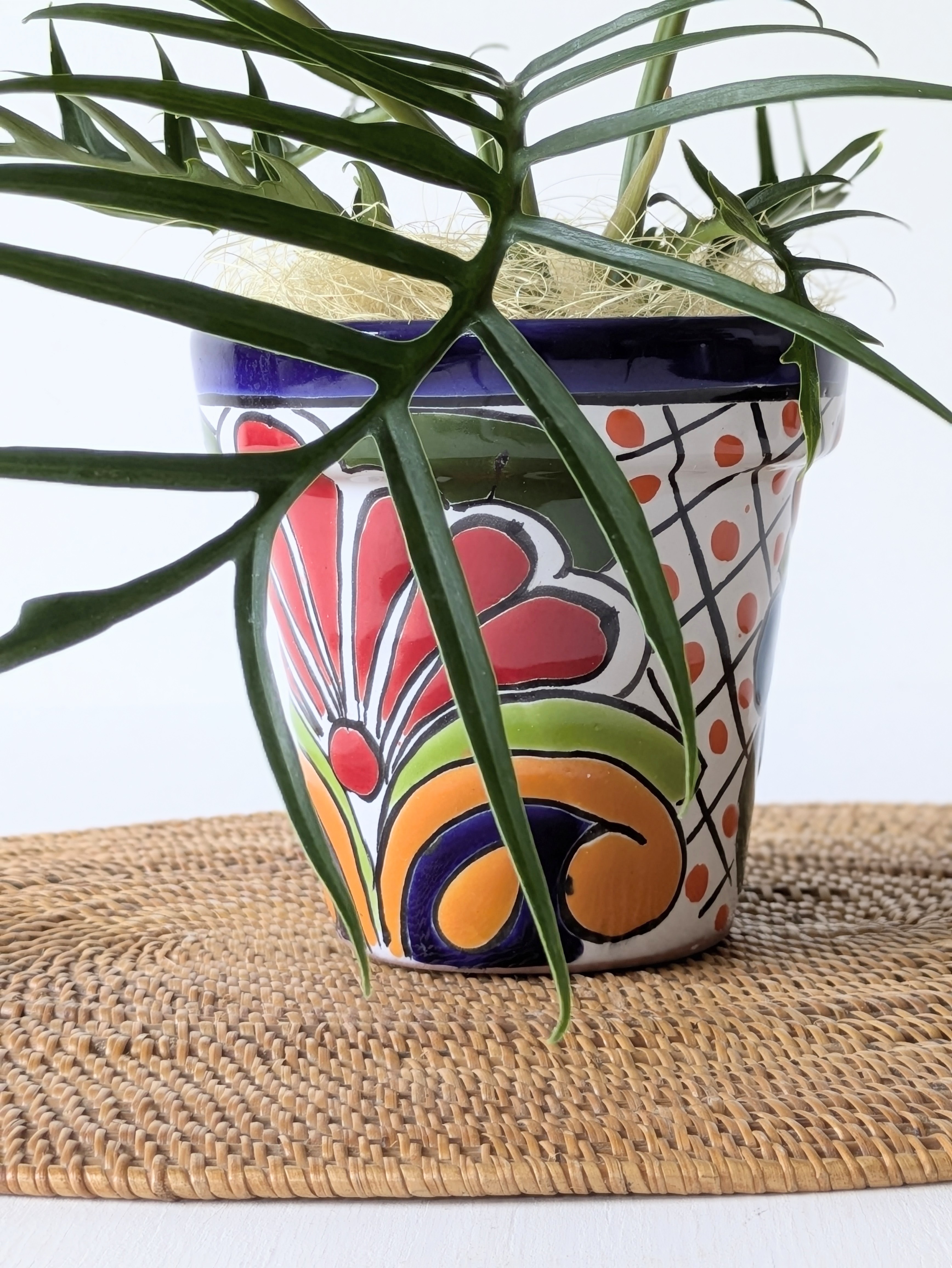 カラフルで心弾むような陶器鉢です。「鉢底穴あり (排水性◎)」