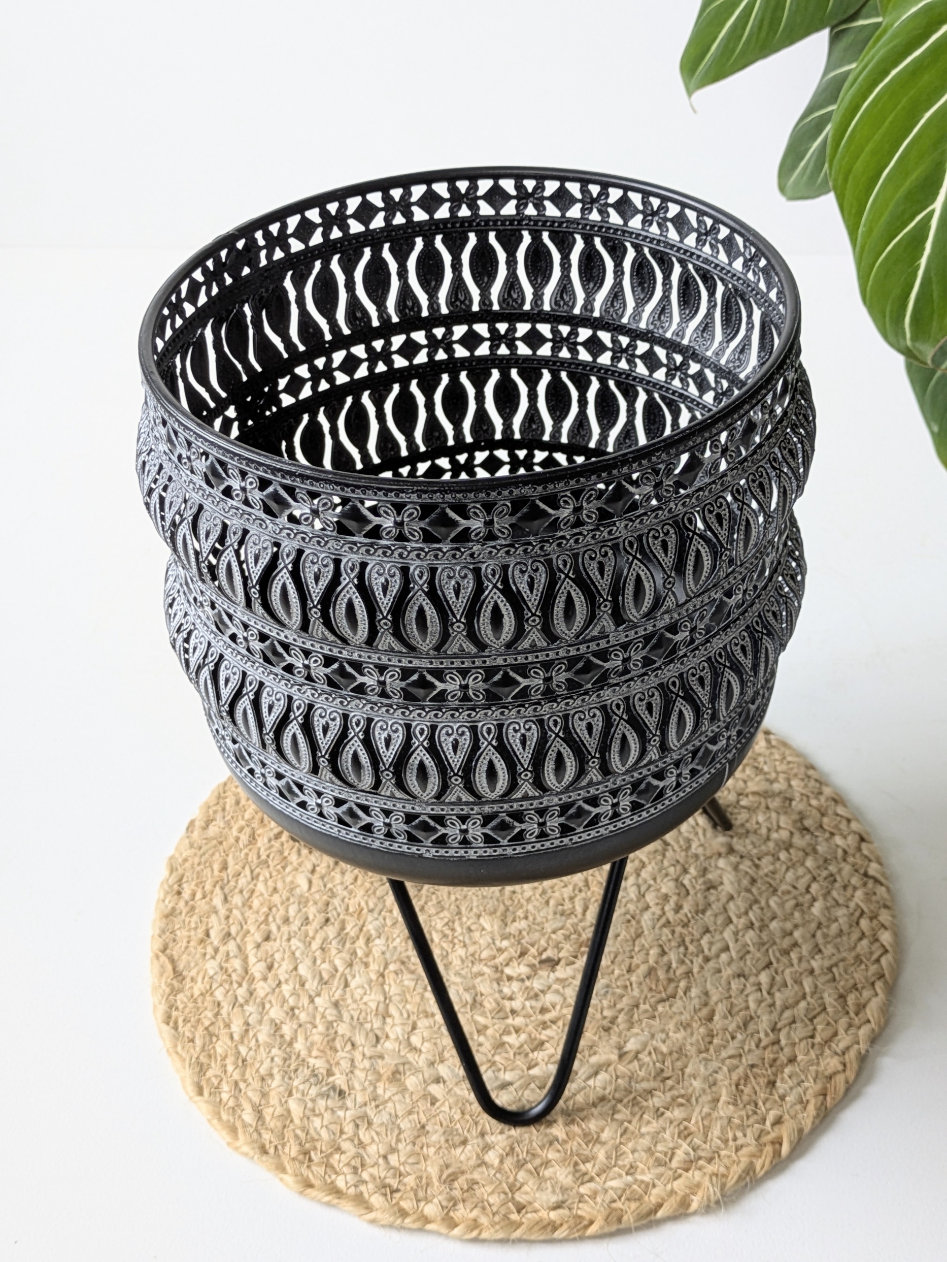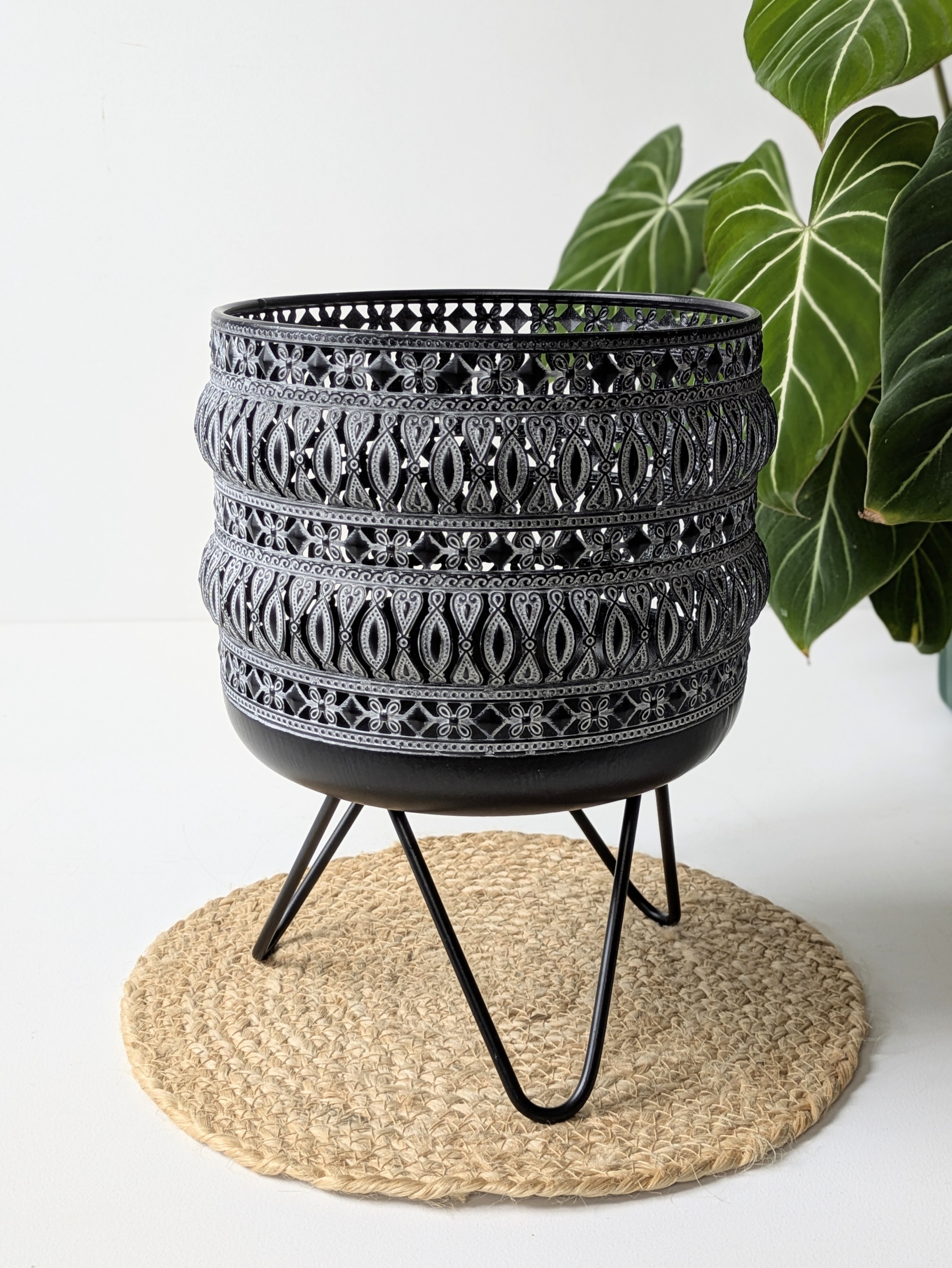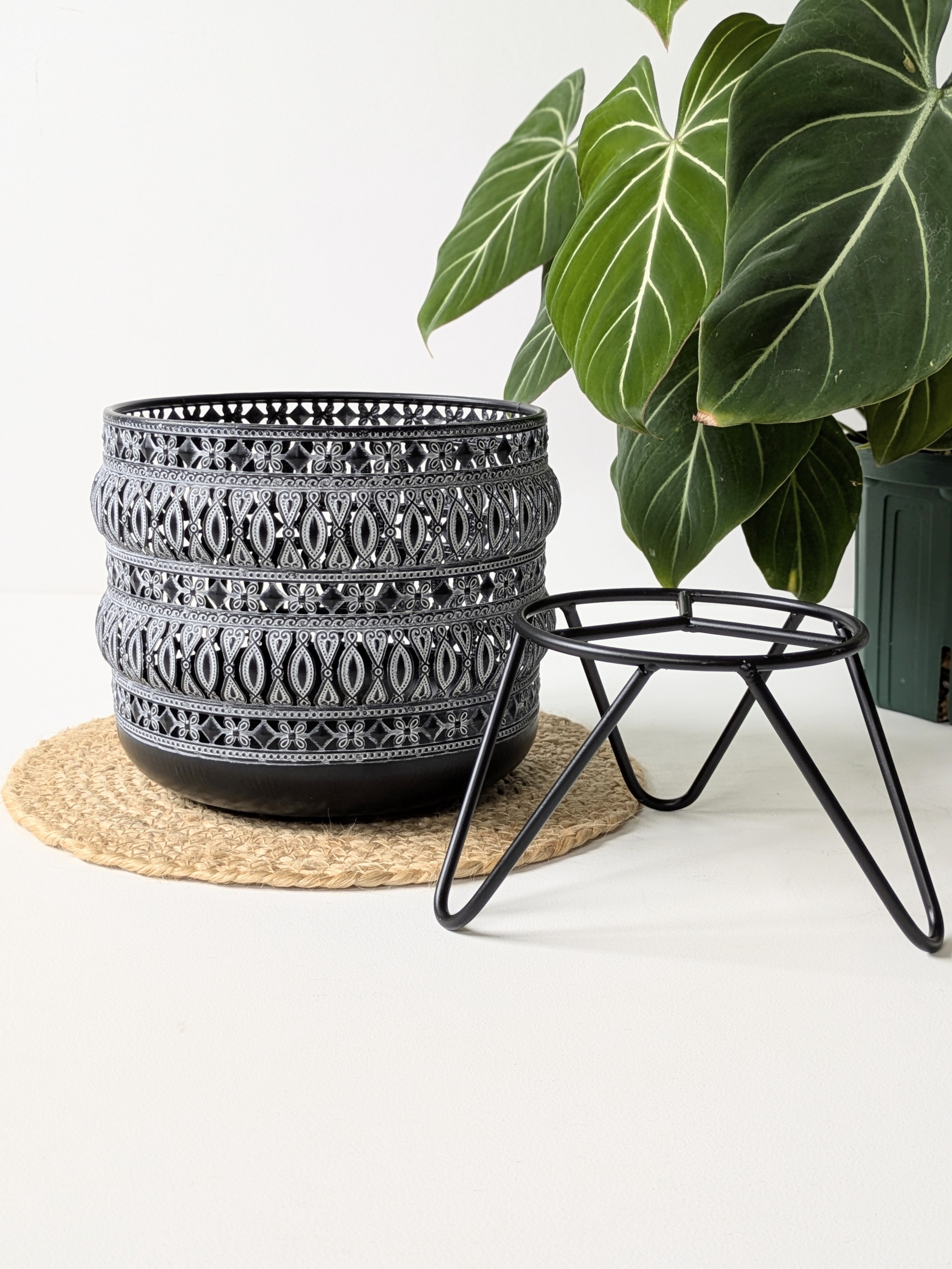 *鉢カバーは、モダンで繊細な透かし模様が施されたアイアン素材。